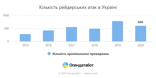 За п'ять років кількість кримінальних проваджень за фактами рейдерства зросла з 290 у 2015 році до 786 в 2019 році.