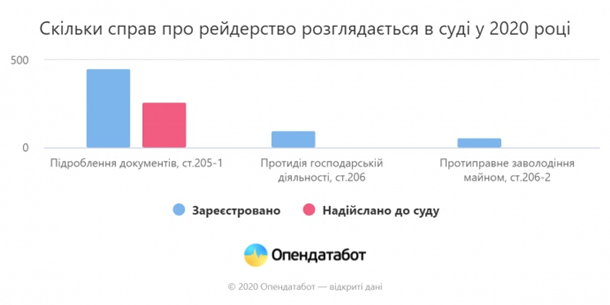 Водночас провадження за ст. 206 КК - Протидія господарській діяльності і протиправне заволодіння майном практично не потрапляють до суду. У 2020 році там розглянуті тільки дві таких справи по всій Україні.