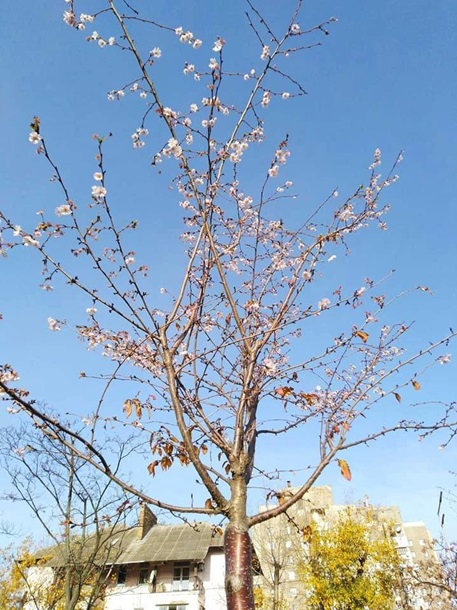 Японські вишні в середині листопада розпустилися на бульварі Верховної Ради у Дніпровському районі столиці.
