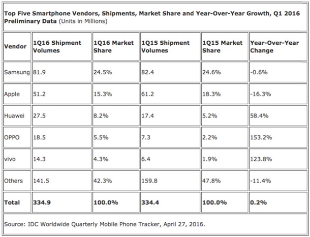 Несподіванкою стало те, що китайським компанія Oppo і Vivo вдалось витіснити з п'ятірки лідерів Xiaomi і Lenovo, взявши на себе 5,5 і 4,3 відсотка світового ринку смартфонів відповідно.