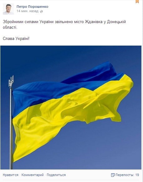 "Збройними силами України звільнено місто Жданівка Донецької області. Слава Україні!", - написав Порошенко.