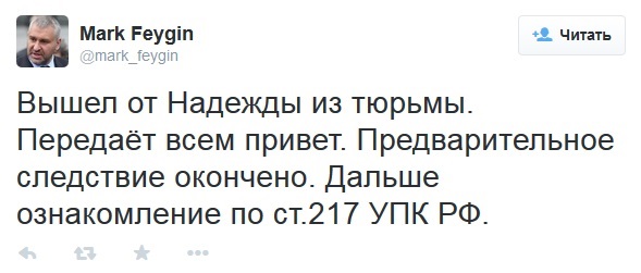 "Вийшов від Надії з в'язниці. Передає всім привіт. Попереднє слідство закінчилося. Далі ознайомлення зі ст.217 КПК РФ", - йдеться в повідомленні.