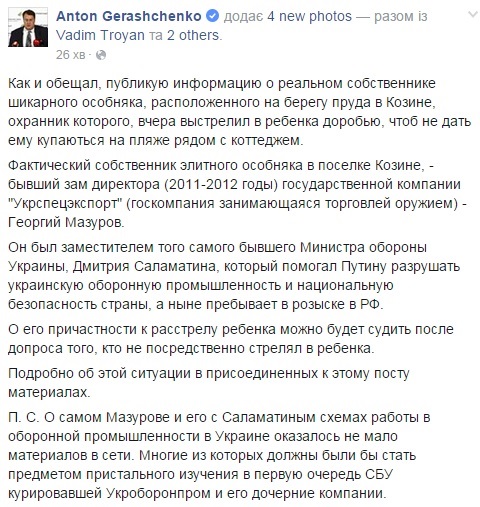 Власником особняка на березі ставка в Козині під Києвом, охоронець якого вистрілив у дитину дробом, є Георгій Мазуров, повідомив нардеп, радник глави МВС Антон Геращенко.