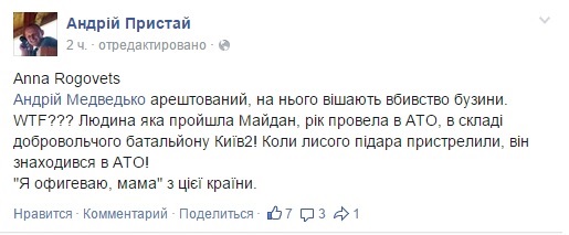 «Зараз не можу точно сказати, але друзі кажуть те, що йому (Медведьку) шиють вбивство - в той час він був у АТО, зафіксований по геолокації дзвінок з Щастя Луганської області», - додав Карась.