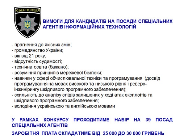 У МВС також оприлюднили вимоги для кандидатів у кіберполіцію. За їх інформацією, конкурс буде продовжаться з 15 жовтня до 1 листопада.