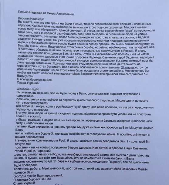 Раніше сьогодні Савченко повідомила, що вирішила припинити сухе голодування після того, як отримала лист від Порошенка.