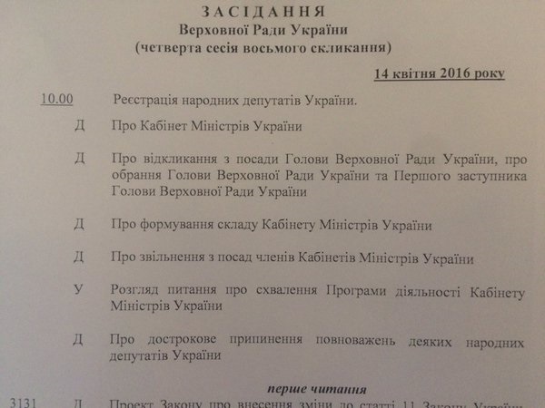 На порядку денному засідання ВР на 14 квітня питання Кабінету міністрів стоїть першим після реєстрації депутатів о 10.00.