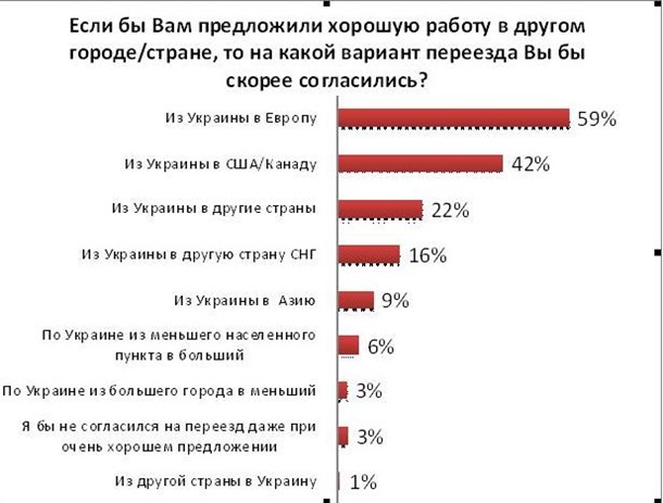 Більше за інших націлені на країни Західної Європи працівники банківської, маркетингової, консалтингової та медичної сфери, а також програмісти та девелопери. Серед цих фахівців відсоток тих, хто зробить вибір на користь еміграції до країн Європи, найвищий - 70-76%. Ці ж фахівці готові переїжджати в США або Канаду.