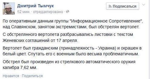 Над Слов'янському в суботу, 19 квітня, був обстріляний вертоліт, з якого розкидалися листівки з текстом Женевських угод від 17 квітня. Про це повідомив керівник Центру військово-політичних досліджень Дмитро Тимчук на своїй сторінці в Facebook.