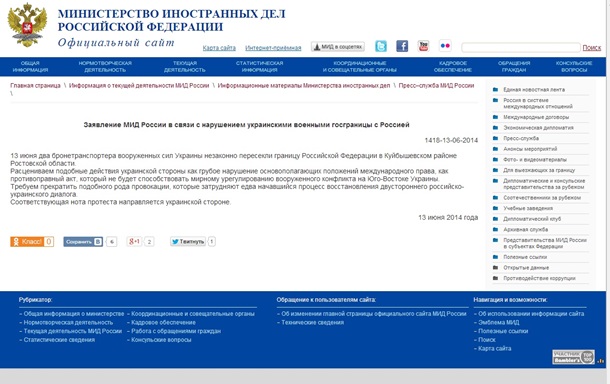 У МЗС Росії заявляють, що 13 червня два бронетранспортери збройних сил України незаконно перетнули кордон Російської Федерації у Куйбишевському районі Ростовської області. "Розцінюємо такі дії української сторони як грубе порушення основоположних положень міжнародного права, як протиправний акт, який не сприятиме мирному врегулювання збройного конфлікту на південному сході України", - сказано в заяві російського МЗС.