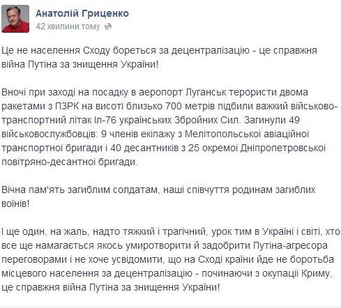 Літак Іл-26 підбили на висоті 700 метрів, повідомляє на своїй сторінці у Facebook народний депутат Анатолій Гриценко.