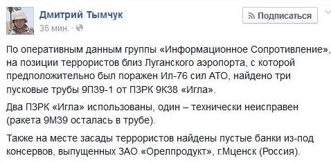 У свою чергу, координатор групи Інформаційний опір Дмитро Тимчук повідомляє, що поблизу Луганського аеропорту, з якого імовірно був підбитий Іл-76 сил АТО, знайдено три пускові труби 9П39-1 від ПЗРК 9К38 Голка.
