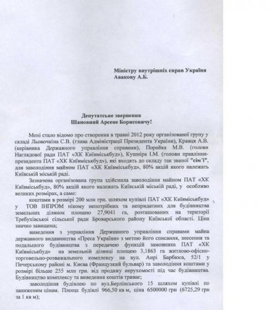 "Мені стало відомо про створення в травні 2012 року організованої групи у складі Льовочкіна С.В. (голова Адміністрації Президента України), Кравця А.В. (керівник Державного управління справами), Порайко Н.В. (глава наглядової ради ПАТ ХК Київміськбуд), Кушніра І.М. (глави правління - президента ПАТ ХК Київміськбуд, 80% акцій якого належать Київській міській раді). Дана організована група вчинила заволодіння майном ПАТ ХК Київміськбуд в особливо великих розмірах", - написав нардеп у своєму зверненні.