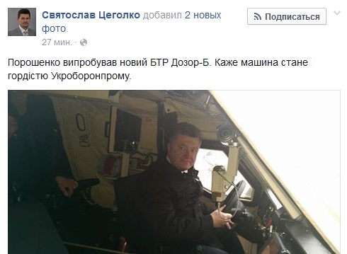 Петро Порошенко випробував новий бронеавтомобіль "Дозор-Б". Про це повідомив прес-секретар президента України Святослав Цеголко у Facebook. Правда, назвав його президентський радник БТРом.