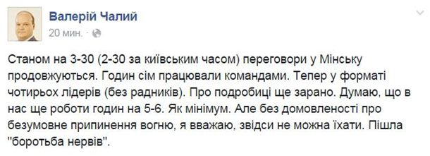3:03 Переговори в Мінську тривають, повідомив заступник глави Адміністрації Президента України Валерій Чалий на своїй сторінці в Facebook.