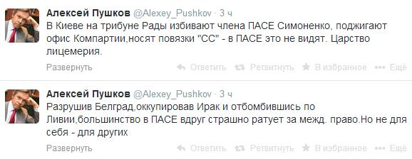 "Зруйнувавши Белград, окупувавши Ірак і відбомбившись по Лівії, більшість у ПАРЄ раптом страшно ратує за міжнародне право. Але не для себе - для інших», - написав він у своєму акаунті в Twitter.