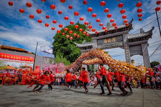 - танець дракона: багато людей тримають на довгих жердинах тіло дракона, створюючи ілюзію його польоту крізь натовп.