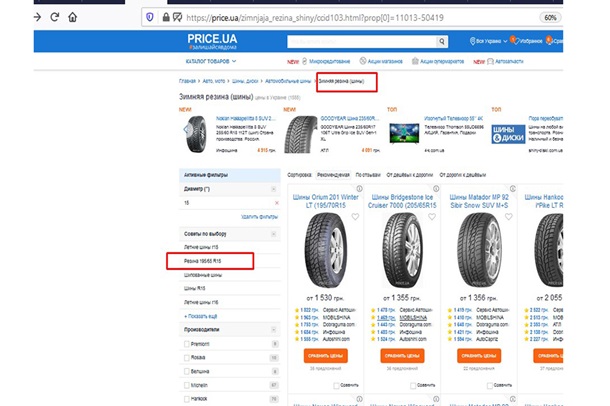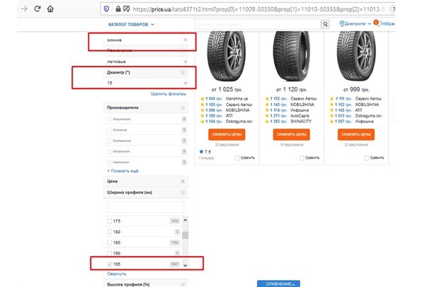 2. Тепер, на Price у розділі Автошини обираємо ці характеристики у блоці фільтрів: