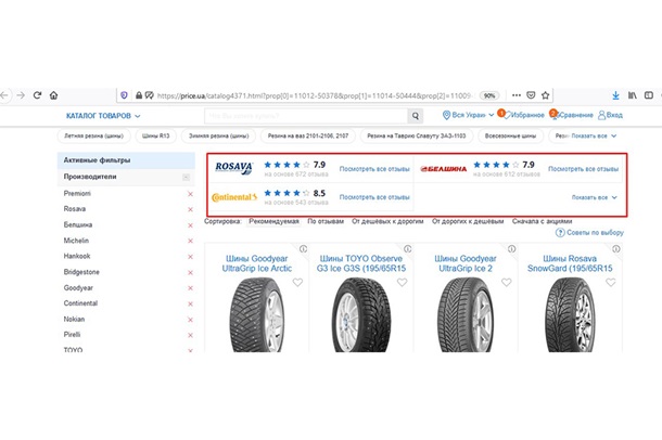 3. Якщо виробник автошин - принципова для вас характеристика, то позначте свій вибір у фільтрах Бренди: у такому випадку ви ще побачите рейтинг на основі відгуків саме у цій категорії.