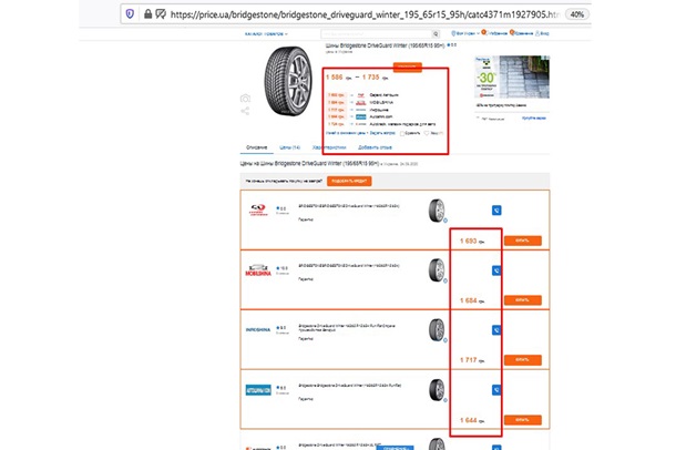 4. Зупинившись на моделі автошини, що вас зацікавила, переходимо до порівняння цін магазинів: