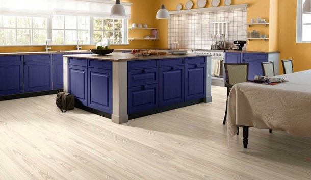 Свіжо і витончено виглядає світлий ламінат на сучасній кухні. Він не буде виглядати занадто помітно, а стане ідеальним фоном для розміщення інших елементів декору. Світлий тон прекрасно поєднується з яскравими меблями, виконуючи роль нейтральної основи.