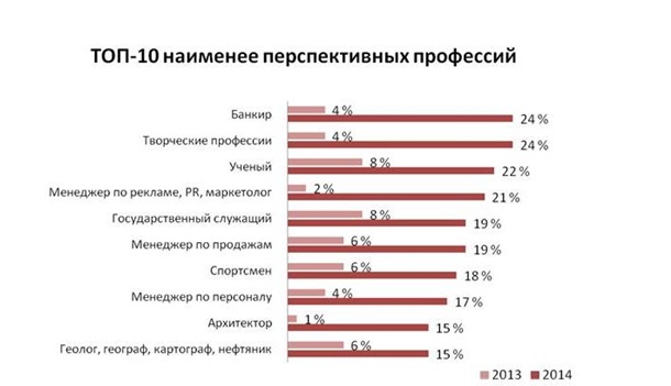 Також відбулися зміни і в рейтингу найменш перспективних професій. Несподівано на першому місці опинилися банкіри, а також представники творчих професій (художники, дизайнери, актори і т.д.).