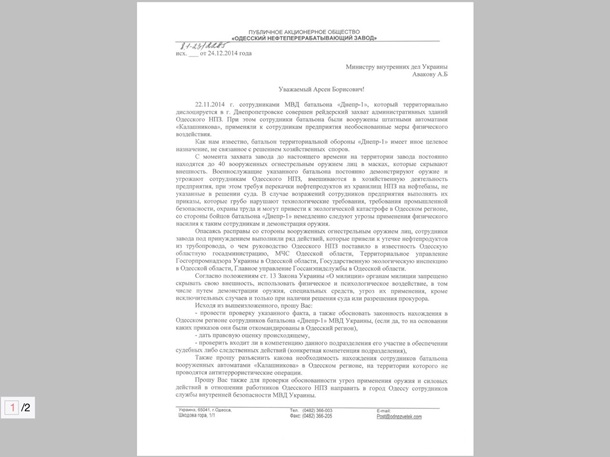 Також гендиректор заводу звернувся до міністра внутрішніх справ Арсена Авакова з проханням провести перевірку на предмет того, чи законно перебувають на території НПЗ бійці батальйону Дніпро.