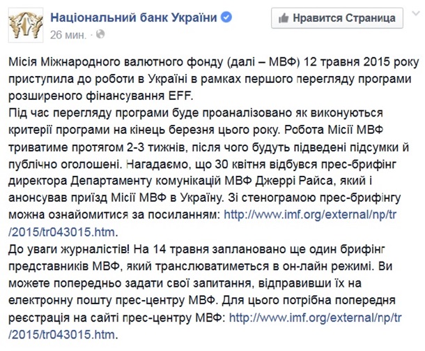 НБУ повідомляє, що місія 12 травня приступила до роботи в Україні в рамках першого перегляду програми розширеного фінансування EFF.