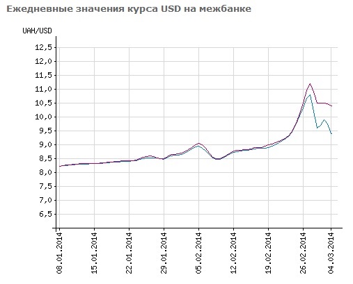У вівторок на міжбанківському валютному ринку України торги з долару США відкрилися котируваннями 10,0000/11,0000, а до 12:00 ціни впали 9,3800/9,5800.