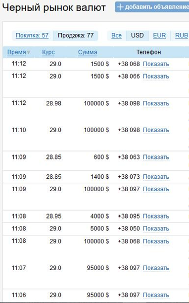 А ось у вуличних обмінних пунктах Києва в порівнянні з вчорашнім днем долар не подорожчав і продовжує перебувати на рівні 28,9 - 29 грн в продажу і 28,7 грн в купівлі.