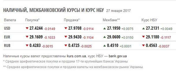 Офіційні курси валют на 27.01.2017: