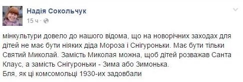 "Мінкультури довело до вашого відома, що на новорічних заходах для дітей не повинно бути ніяких діда Мороза і Снігуроньки. Повинен бути тільки Святий Миколай. Замість Миколи можна, щоб дітей розважав Санта Клаус, а замість Снігуроньки - Зима або Зимушка", - написала вона.