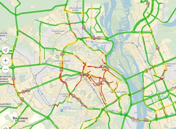 Станом на 16:10 у столиці затори оцінюються в 6 балів. Крім того, як повідомляють очевидці, в центрі Києва немає регулювальників, рух майже повністю зупинилося.