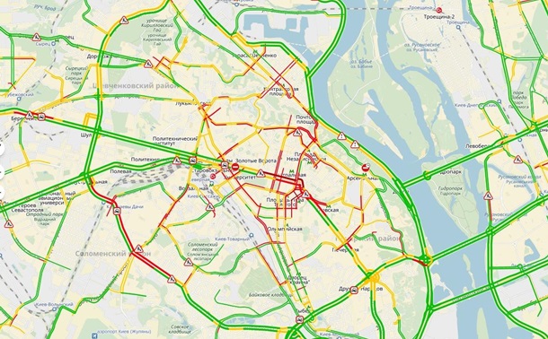 Рух ускладнено на вул. Інститутській, Прорізній, Великій Васильківській, Антоновича, Володимирській, Михайлівській. Бульвар Тараса Шевченка "стоїть" через проведення ремонтних робіт.