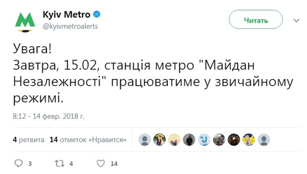 "Завтра, 15.02, станція метро "Майдан Незалежності" працюватиме в звичайному режимі", - йдеться в повідомленні.