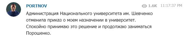 "Адміністрація Національного університету ім. Шевченка скасувала наказ про моє призначення в університет. Спокійно приймаю це рішення і продовжую займатися Порошенком", - повідомив у своєму Telegram-каналі Портнов ввечері 20 червня.