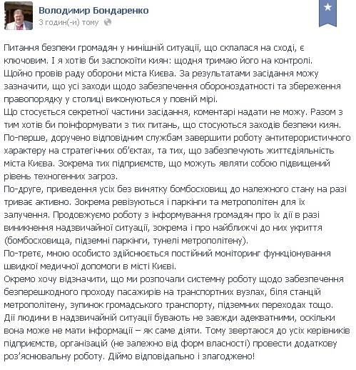 У Києві триває активна робота з приведення всіх бомбосховищ у належний стан. Про це написав голова Київської міської державної адміністрації Володимир Бондаренко на своїй сторінці у Facebook, інформуючи про засідання ради оборони міста Києва, яке відбулося кілька годин тому.