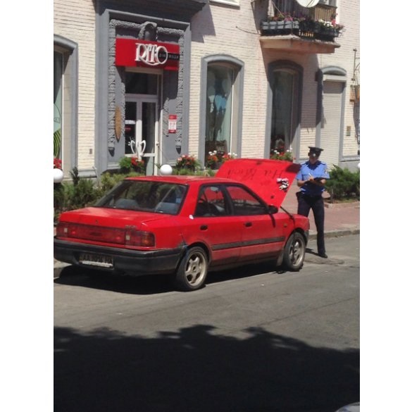 Громадяни побачили на вулиці Ігоревській на Подолі автомобіль Mazda-323 зі встановленою на капоті каністрою, обліпленою чорним скотчем та ременями. Від каністри відходив шланг у відсік двигуна.