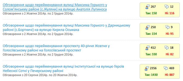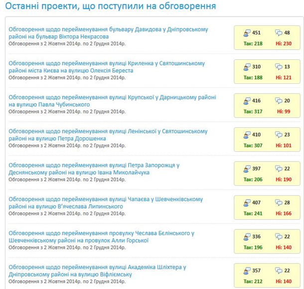 Поки юристи розповідають про можливі труднощі, а чиновники готують чергові списки перейменування вулиць (відомо вже про більше ніж 25 варіантів), думка жителів щодо цієї ініціативи розділилися. Про це свідчать перші результати громадського обговорення на сайті КМДА.