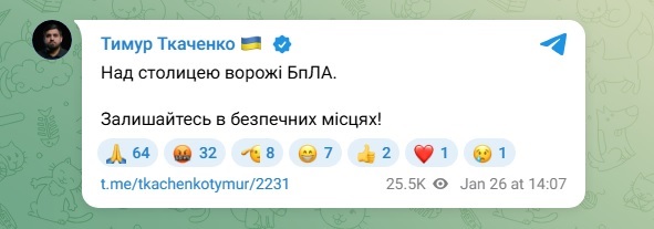 Російська армія знову почала проводити активну розвідку Києва та Київської області. Так, в понеділок, 26 січня, вдень над столицею та її передмістям були зафіксовані ворожі дрони, через що повітряна тривога тривала понад чотири години.