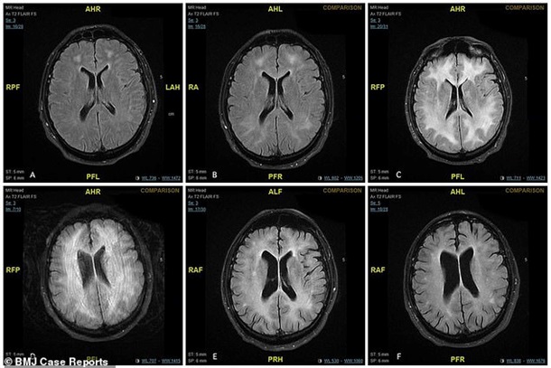 Лікарі продовжили лікування чоловіка, і весь час робили знімки мозку пацієнта. Повідомляється, що білі плями на фото - це мертві клітини мозку, які змогли відновитися. На корі головного мозку пацієнта залишилися шрами навіть через рік.