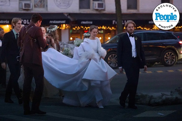 Для особливого дня наречена обрала стриману, але вишукану білу сукню без рукавів із закритим верхом та багатошаровою спідницею. Образ доповнили мінімалістичний букет із білих квітів і зелені, світле взуття та ефектне оверсайз-пальто з пір’ям. Наречений з’явився у класичному смокінгу з білим жилетом і чорним метеликом. Світлини з церемонії опублікувало видання People.