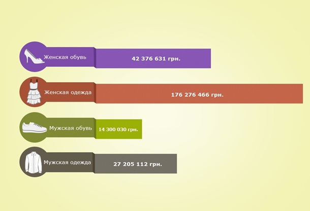На сайті розміщено понад 570 тисяч оголошень про продаж одягу та взуття на загальну суму 265 мільйонів гривень. При цьому 176 мільйонів гривень з цієї суми - це жіночі речі, а ще 42 мільйони - жіноче взуття.