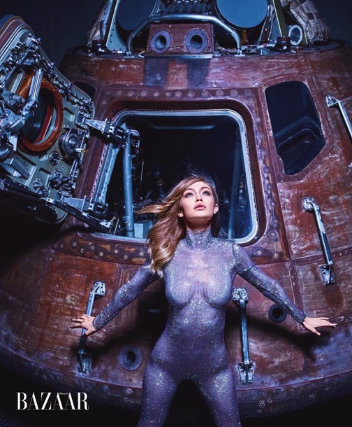 На одному знімку модель в сріблястому обтислому комбінезоні позує біля космічного апарату з відкритим люком. Хадід дивиться вгору, розвівши руки в сторону і закинувши трохи назад.