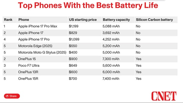 У Cnet звертають увагу, що смартфони Apple традиційно демонструють високі показники автономності, попри те що компанія залишається однією з небагатьох на ринку, яка досі не використовує кремнієво-вуглецеві акумулятори. Це, на думку експертів, підкреслює ефективність оптимізації енергоспоживання в iOS та апаратній частині пристроїв.