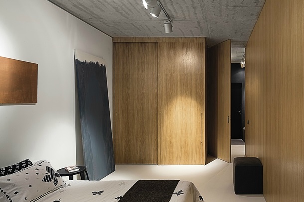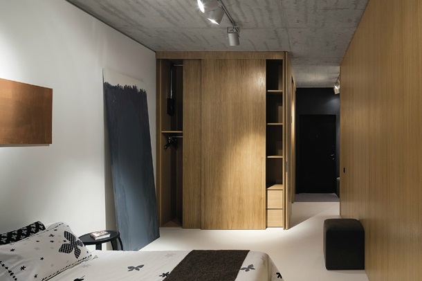 Автори проекту буквально склеїли невеликий гардероб, що примикає до передпокою, із шафою у спальні. Вийшов акуратний покритий шпоном куб з окремим входом у кожне з “відділень”. Щоб двері у спальню не виглядали бідним родичем, до ансамблю приєднали і їх: у відкритому стані вона, як плоска риба камбала, повністю зливається із шафою.