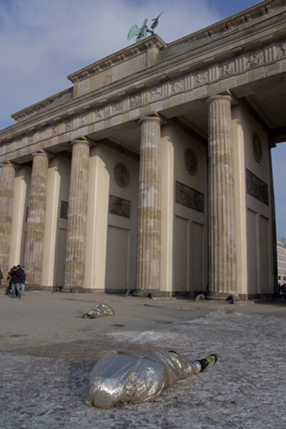 Перед Бранденбурзькими воротами обмотані термофольгою учасники акції пролежали при мінусових температурах кілька годин на зледенілій землі, символізуючи загиблих у Києві.