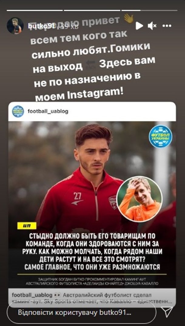 Таким чином, колишній футболіст відреагував на камінг-аут представника Австралійської ліги Джошуа Кавалло. Свою думку щодо геїв Бутко опублікував на власній сторінці в Instagram.