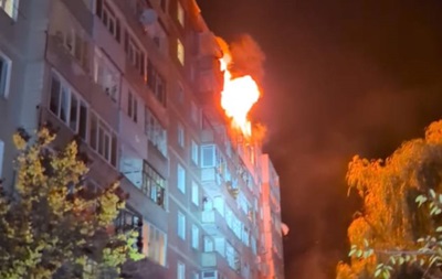Внаслідок влучання в дев'ятиповерховий житловий будинок на верхніх поверхах загорілися п'ять квартир та сім балконів.
