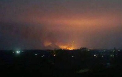 Спалахи від пожежі помітні на великій відстані. За попередніми даними, у склад влучила ракета.